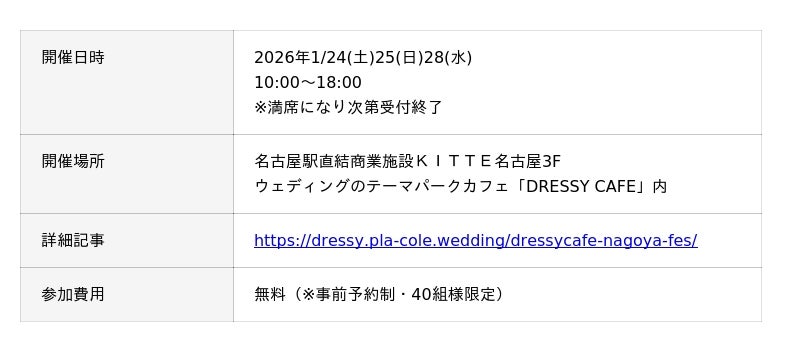 「PLACOLE & DRESSY」ブランドを展開する、冒険社プラコレ(本社:神奈川県鎌倉市、代表取締役CEO:武藤功樹)は、名古屋駅直結商業施設KITTE名古屋3F、ウェディングのテーマパークカフェ”DRESSY CAFE”にて、1/24(土)25(日)28(水)の3日間限定で、これから結婚式をお考えのカップル様に向けた、個室相談やウェディングドレス試着ができる豪華特典付きのウェディング初体験フェスを開催いたします。(40組様限定、無料開催)