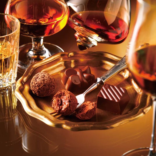 ヘネシーXO、マイヤーズラム、マローロ グラッパ・ディ・バローロ20年、ポートシャーロットの4種の名酒を使用したプラリネショコラ。中のガナッシュには洋酒の味わいを引き立てるミルクチョコレートを使用しています。宝石箱のような贅沢感を感じられるひと箱です。