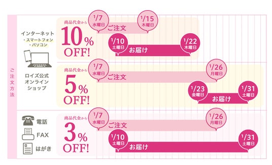 ロイズ通信販売にて「早期割引キャンペーン」を2026年1月7日より開催中です。お届け先1件につき、商品代金7,500円以上(税込/送料・手数料別)のお買い上げが対象のお得なキャンペーンをぜひご利用ください。