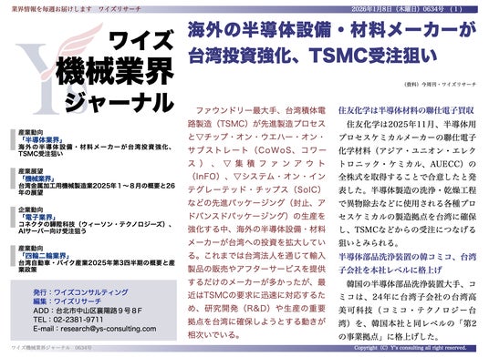 ワイズコンサルティング グループ(本社:中華民国台北市、代表取締役:吉本康志)は台湾機械業界専門誌「ワイズ機械業界ジャーナル」の2026年1月第1週号を発行しました。