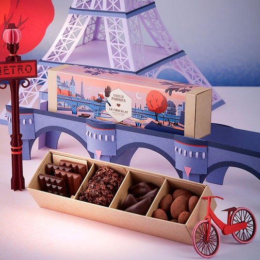 ル・ショコラ・アラン・デュカス自慢のショコラ4種:ドラジェ、オランジェット、ミニタブレット、ロックのアソート。カカオの風味際立つショコラをバラエティ豊かに楽しめるバレンタイン限定BOXです。