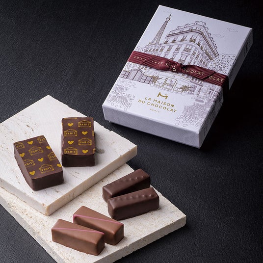 バニラとペッパーの風味を加えたプラリネやルバーブのピュレを用いたダークガナッシュなど3種の限定レシピ。ラ・メゾン・デュ・ショコラ始まりの地をコレクション名に入れ、フランスらしいシックでエレガントな魅力あるコレクションです。