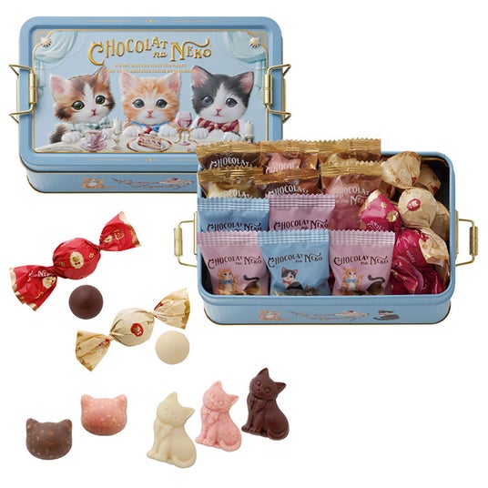 子猫たちのスイーツパーティーを描いた素敵な缶が新登場。アフターユースしやすい大きめサイズの缶は、器のロックが可能な新機能付き。ザクザク食感が楽しいクランチチョコレートや風味豊かなトリュフなど、さまざまな味わいに心ときめく詰め合わせです。