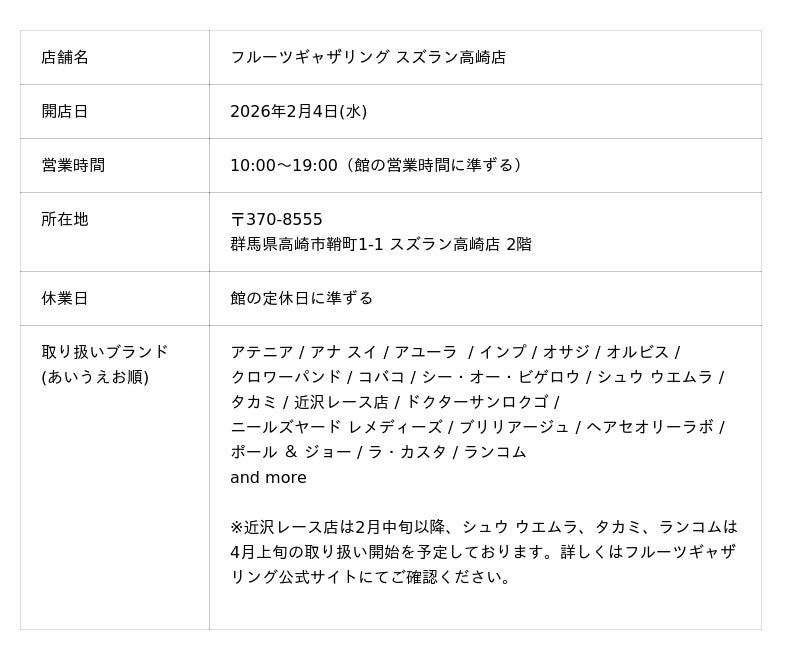 エフ・ジー・ジェイ株式会社(本社:東京都港区、代表取締役社長:吉田 和弘)が運営するビューティセレクトショップ「フルーツギャザリング」は、2026年2月4日(水)に、群馬県高崎市の百貨店「スズラン高崎店」に、29店舗目となる新店をオープンします。