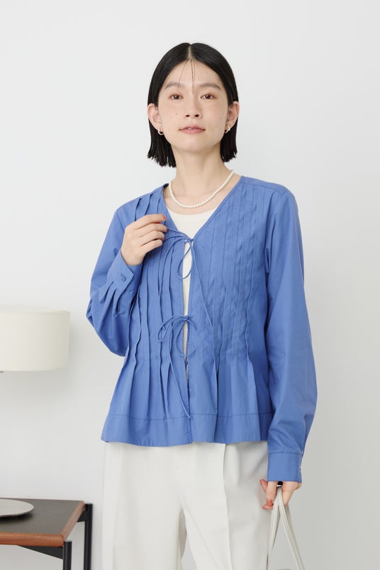 繊細なピンタックとリボンタイがレディな抜け感を出しつつ、クロップド丈でどんなボトムスとも好バランスに。