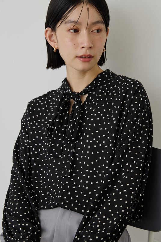 リボンをお好みで結んでいただけるドット柄のブラウス。