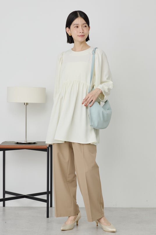 落ち感のある優しい素材が着心地の良いタイブラウス。