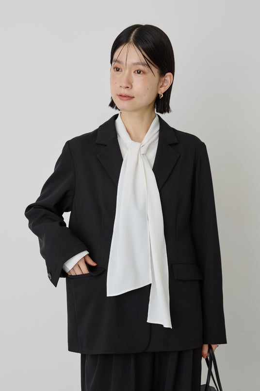 襟周りにデザインのあるブラウスに羽織って、すっきりとしたノーカラーを上品に引き立たせるのがおすすめ。