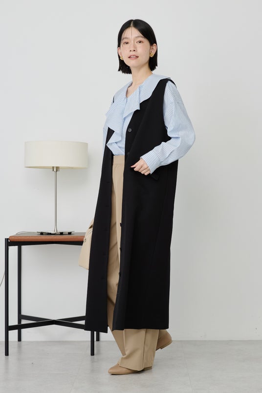 ノーカラーのロングジレとしても、Iラインワンピースとしても着られる着回し自在なアイテム。