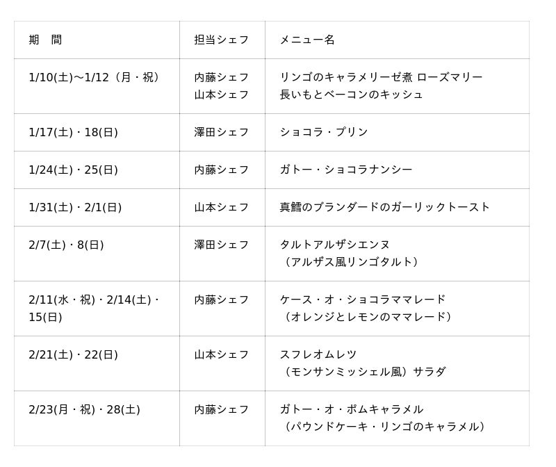 本ランチブッフェでは、チーフペストリー・シェフ 内藤 隆(ないとう たかし)と、この冬、新たに加入したペストリー・シェフ 澤田 康秀(さわだ やすひで)が「冬のデザート」をテーマに饗宴。