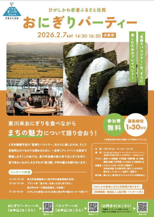 本バスツアーの開催に先立ち、2月7日(土)14:30より東京・大手町の「3×3 Lab Future」にてプレイベントを開催いたします。自慢の「東川米」を使ったおにぎり作りや、役場職員・地域おこし協力隊との交流を通じて、一足早く東川町の魅力に触れていただける機会となります。参加費は無料で、1月30日まで参加者を募集しています。