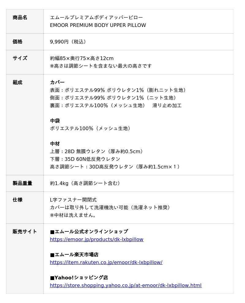 「身体に合った寝る・座る・たたむ」を提供する健康家具ブランドEMOORを展開する株式会社エムール(東京都立川市:代表取締役 高橋 幸司/以下エムール)は、2026年1月9日より『エムールプレミアムボディアッパーピロー(以下、ボディアッパーピロー)』の販売を開始しました。