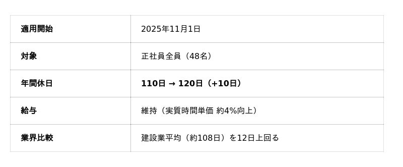 静岡県浜松市の建設会社・株式会社LIFEFUNDが、2025年11月より正社員全員の年間休日を110日から120日へ引き上げる。給与水準は維持されるため、時間あたりの賃金は実質約4%向上する計算だ。