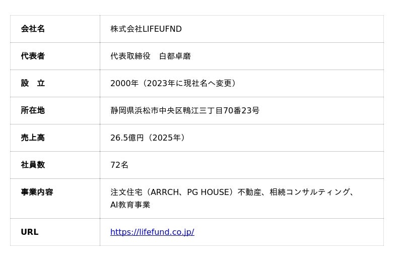 株式会社LIFEFUNDは静岡県浜松市を代表する建築会社。事業は相続コンサル事業からAI教育事業まで多岐にわたる。