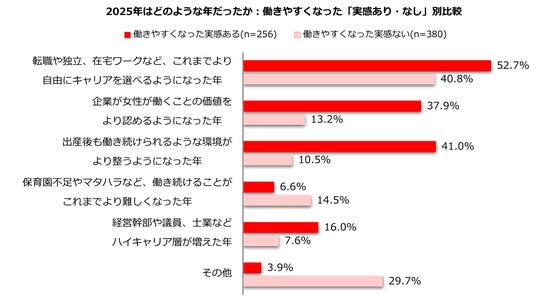 高市首相が誕生した2025年。主婦層を中心とする就労志向の女性に前年より働きやすくなった実感があるか尋ねたところ、「ある」と回答した人は40.3%で「ない」が59.7%と上回りました。しかしながら、過去3年を振り返ると毎年「ある」が上昇してきています。働きやすくなったと実感する理由としては「働く女性の数が増えてきた」が63.3%で最多。また2025年はどのような年だったかという質問には「転職や独立、在宅ワークなど、これまでより自由にキャリアを選べるようになった年」と答えた人が45.6%で最多でした。直近3年の推移を確認してみると「出産後も働き続けられるような環境がより整うようになった年」「企業が女性が働くことの価値をより認めるようになった年」が3年連続上昇。「経営幹部や議員、士業などハイキャリア層が増えた年」は2025年になって大きく上昇しています。2025年に働きやすくなった実感の有無別での比較では、これらの項目はすべて実感が「ある」と答えた人の比率が大きく上回っています。一方で、「保育園不足やマタハラなど、働き続けることがこれまでより難しくなった年」とネガティブな回答を選んだ比率は、実感が「ない」と答えた人の方が上回っており、働きやすさへの受け止め方が二極化している様子が伺えます。