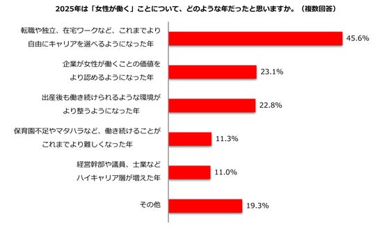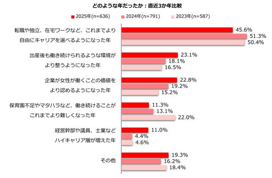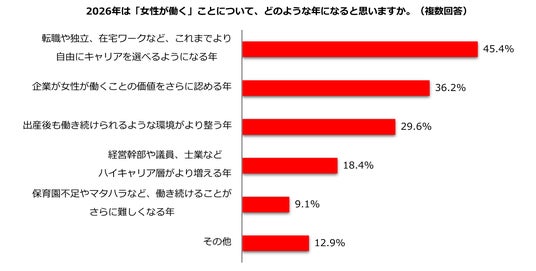 2026年がどのような年になるかについても「これまでより自由にキャリアを選べるようになる年」とする回答が最も多いなど、2025年に対する評価と同様の傾向が見られます。さらに「2026年は、2025年より「女性が働きやすくなる」と思いますか」との質問に対しては、実に62.7%が「思う」と答えました。前年より女性は働きやすくなると思うと回答した人の比率は、直近3年で上昇傾向にあります。フリーコメントでは、他調査(※)でも確認されたように、女性首相が誕生したことをポジティブに受け止める声がいくつも見られました。今年は午年。女性がより働きやすくなり、女性活躍から女性飛躍の年になっていく期待感の高まりを感じます。