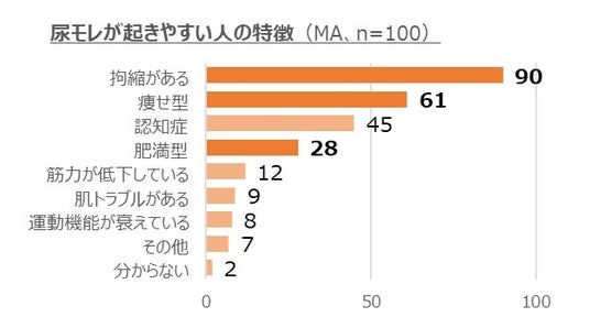 前述の介護従事者へのアンケート調査では、おむつ交換の課題として、92%の方が「利用者ごとにおむつの“あて方”を工夫しないと上手くいかない」と感じていることが明らかになりました。これは、「拘縮や体型の違いなどによって、尿モレが起きやすい方がいる」ためだと考えられます。