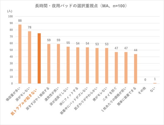 当社が実施した介護従事者へのアンケート調査では、長時間・夜用パッドの選択において「吸収量が多い」「尿がモレない」といった基本性能に次いで、「肌トラブルが起きない」ことが重視されていることが判明しました。※1