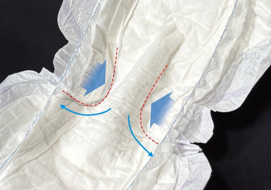 – 脚まわりの波型カットパッドの両サイドの波型カットが装着時の肌擦れを軽減し、様々な体型に柔軟に対応します。そけい部でのつっぱりも防止し、装着感を向上します。