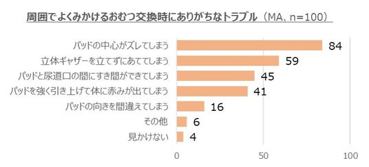 一方で、おむつ交換時にありがちなトラブルとしては、「パッドの中心がズレてしまう」「立体ギャザーを立てずにあててしまう」といったミスが多いことが判明しました。