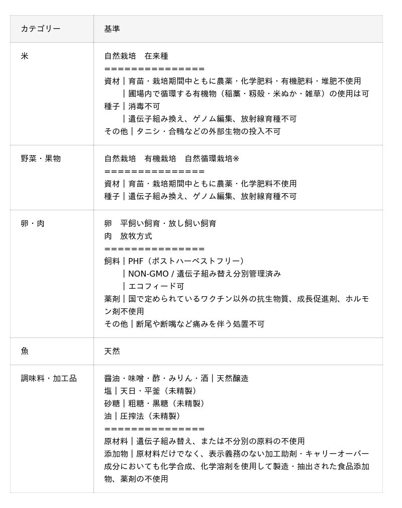 米と野菜、果物は自然栽培と有機栽培。卵は平飼い、肉は放牧、魚は天然。