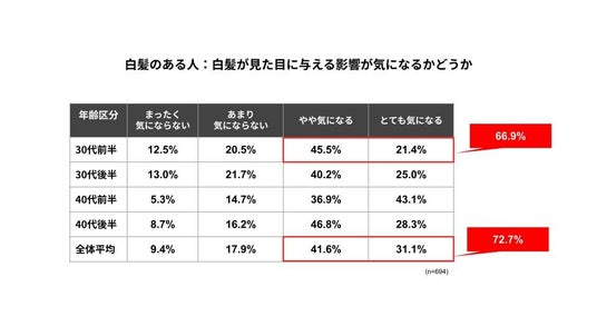 では、「白髪がある」と回答した30代~40代女性は、白髪が自身の見た目に与える影響についてどのように考えているのでしょうか。「白髪による見た目への影響が気になりますか」という問いに対し、「白髪がある」と回答した694名のうち72.7%(505名)が「とても気になる」「やや気になる」と回答。白髪はあっても少し・部分的にあるという割合がもっとも大きい30代前半でも、66.9%が気にしていると回答しています。