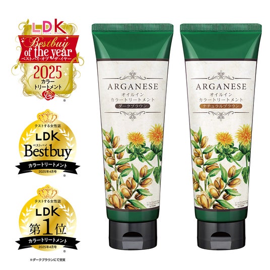 アルガネーゼ オイルインカラートリートメント(内容量:180g)アルガンオイルをはじめとした美髪オイル(保湿成分)を配合。美髪成分89%(精製水含む)、放置時間たった3分で、白髪をツヤサラな髪へ仕上げます。 ダークブラウンは、テストする女性誌「LDK」(株式会社晋遊舎)2026年1月号において、「LDK ベストバイ オブ・ザ・イヤー」を受賞。取り扱い:ECモール公式店(楽天市場、Amazon、Yahoo!ショッピング)、全国の生活協同組合、ドラッグストア
