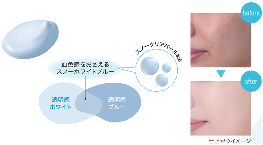 スノークリアパールやアゼライン酸(保湿)を配合し、色だけではなく透明感のある明るさを実現。血色感をおさえて澄んだ肌を演出します。