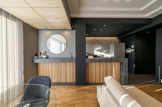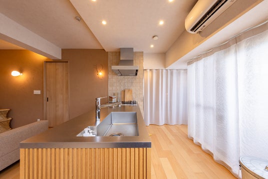 中古マンションだからこそ手に入れられた、十分な広さと大きなルーフバルコニーを備えた物件をホテルライクにリノベーションした事例。生活動線の良い3LDKの間取りや折り上げ天井など既存の部分も活かしながら、リノベーションにより内装デザインを一新。キッチンの背面には和モダンなホテルをイメージした木の縦格子をあしらい、ひとつの家具のような存在感を出しています。さらに、玄関や廊下、洗面室、キッチンの天井や壁はグレーのタイルや黒のクロスを締め色として採用し、明暗のメリハリある空間に仕上げました。