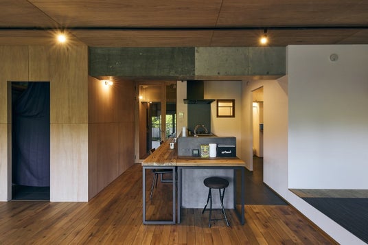 造作した特注家具や意匠性の高い素材を多く使い、メリハリを意識したリノベーションです。天井にはラワン合板を貼った大胆なデザイン。