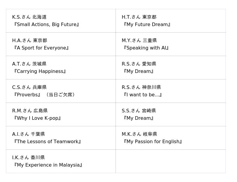 ■中学生以下:全19名(イニシャル/通学都道府県/スピーチテーマ)