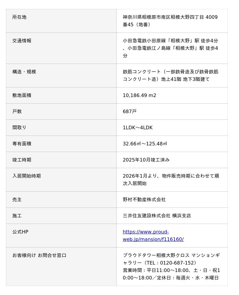 野村不動産株式会社(本社:東京都港区/代表取締役社長:松尾大作、以下「当社」)は、新築分譲マンション「プラウドタワー相模大野クロス(所在地:神奈川県相模原市、以下「本物件」)」が2025年10月に竣工し、2026年1月より入居開始することをお知らせします。