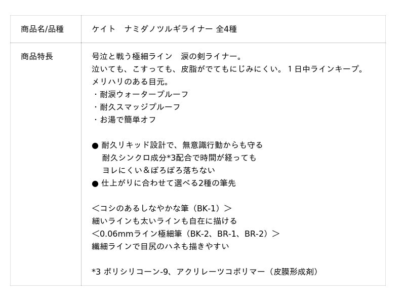 2種の皮膜形成剤をブレンドした「耐久シンクロ成分*3」を配合。硬くて強い膜と伸縮性を両立する被膜を形成する耐久リキッド設計です。微細なポリマー配合の塗膜「超密着ラスティングポリマー(アクリレーツコポリマー)」が肌になめらかに密着。微小な凹凸に入り込み強固な膜を形成します。目もとにピタっと密着し目まわりの激しい動きにも追随し、肌上に描かれたラインを崩さず維持します。