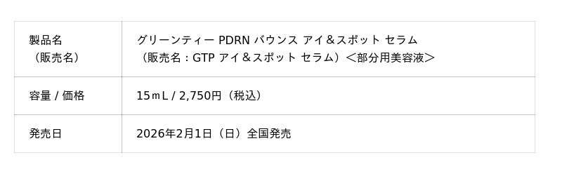 アモーレパシフィックジャパン株式会社(本社:東京都渋谷区)が展開する、自然主義アクティブスキンケアブランド [INNISFREE | イニスフリー] は、美容クリニックの施術に着目した「レチノール×PDRNライン」から『グリーンティー PDRN バウンス アイ&スポット セラム』を、2026年2月1日(日)より発売いたします。