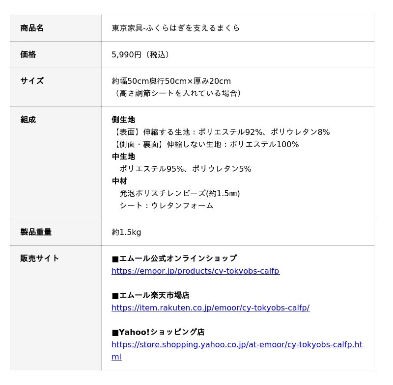 健康家具ブランドEMOORを展開する株式会社エムール(東京都立川市:代表取締役 高橋 幸司/以下エムール)は、2026年1月19日より、膝下からふくらはぎ全体をやさしく持ち上げ、自然な角度で支えることで、脚が軽くなるような感覚をサポートする『ふくらはぎを支えるまくら』の販売を開始しました。