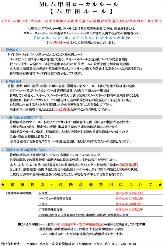 八甲田山岳スキー安全対策協議会により制定されております。ルールでは、警察から同協議会に遭難・捜索救助の要請があった場合、救助に関わる費用を遭難者に請求する。スキー、スノーボード、登山にかかわらず管理区域外、閉鎖中のコース、営業時間外での捜索・救助活動が対象で、捜索に当たった人員の日当1人当たり3万円、ロープウエー時間外運行費1回5万円、リフト時間外運行費1回1万円など。The Hakkoda Mountain Ski Safety Council has established the “Mt. Hakkoda Local Rules.”