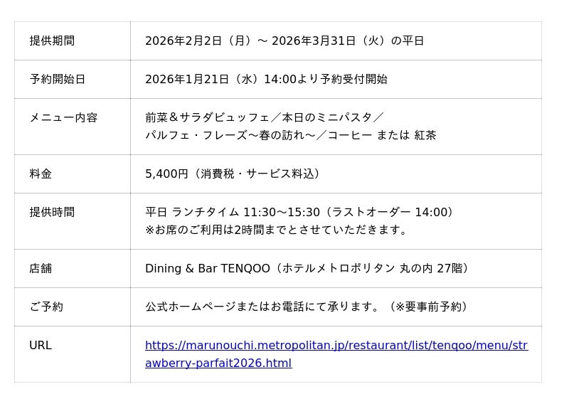 ホテルメトロポリタン 丸の内(所在地/千代田区丸の内、総支配人/桃谷健志)のダイニング&バー「テンクウ」では、2月2日から3月31日までの平日、デザートにいちごパフェが付いたランチセットを販売いたします。草木の芽吹きと花の彩りという春の訪れを、食材の色と香りで表現したパフェをご用意しております。
