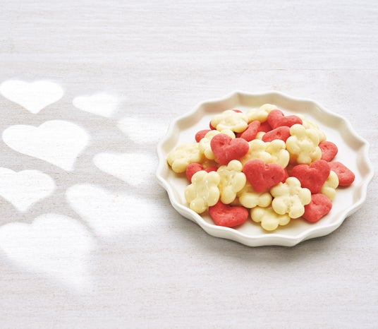 ショコラを纏った新食感おかき。ハート型の「イチゴショコラ」と花型の「ホワイトショコラ」をミックスした、この時期だけの限定商品。