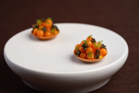 クミン風味のキャロットピュレをタルトカップ1個につき約5g入れる。 にんじんグラッセをたっぷり乗せる。少量のキャビアを加え、飾り用ににんじんの葉を添える。
