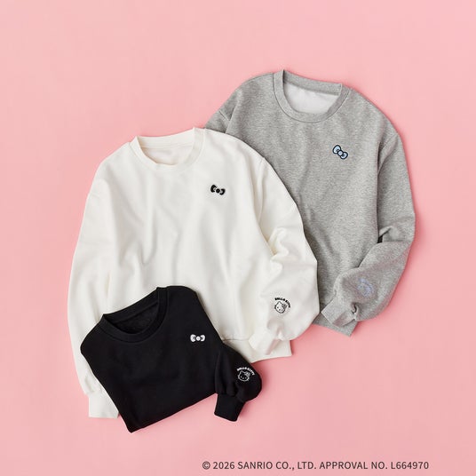 ハローキティのアイコンでもあるリボンモチーフを胸元に刺繍した裏毛プルオーバー。