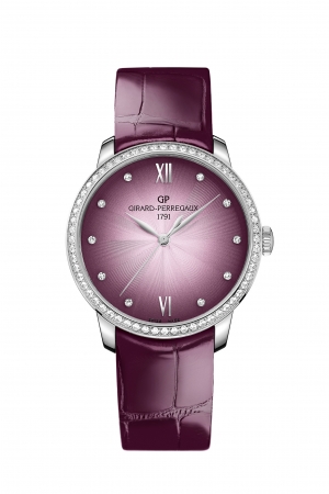 ダイヤモンドがセットされたインデックス、6時と12時位置には丁寧に磨き上げられたローマ数字のインデックスが時刻を際立たせ、そこに二つのエレガントなリーフ型針が融合し、美しくエレガントなデザインへと昇華しています。絶妙なサイズ感と女性らしい華奢さのモデルは、ジラール・ペルゴの自社製機械式自動巻ムーブメントGP03300で時を刻み、約46時間のパワーリザーブを提供します。サファイアクリスタルのケースバックからは、メゾンの美しい仕上げを施されたムーブメントが姿を現します。