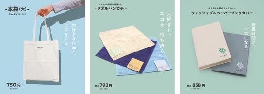 「本袋(大)」は、出版業界ならではのコンテンツやキャラクターをデザインしたエコバッグです。A4がすっぽり入る大きめのサイズで、裏面にはポケットが2つ付いており、本を入れるだけでなく、さまざまな用途にお使いいただけます。また、商品からタグまで石油由来のものは一切使用せず、売上金の一部は環境保全団体OWSへ寄付いたします。