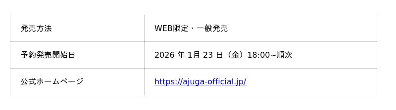 2026年1月23日(金)18:00より公式WEBストア(https://ajuga-official.jp/)にて先行予約販売をスタートします。