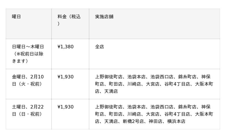 ・上野御徒町店、池袋本店、池袋西口店、錦糸町店、神保町店、町田店、川崎店、大宮店、谷町4丁目店、大阪本町店、天満店は¥1,930(税込)で金曜、土曜、祝前日も開催します