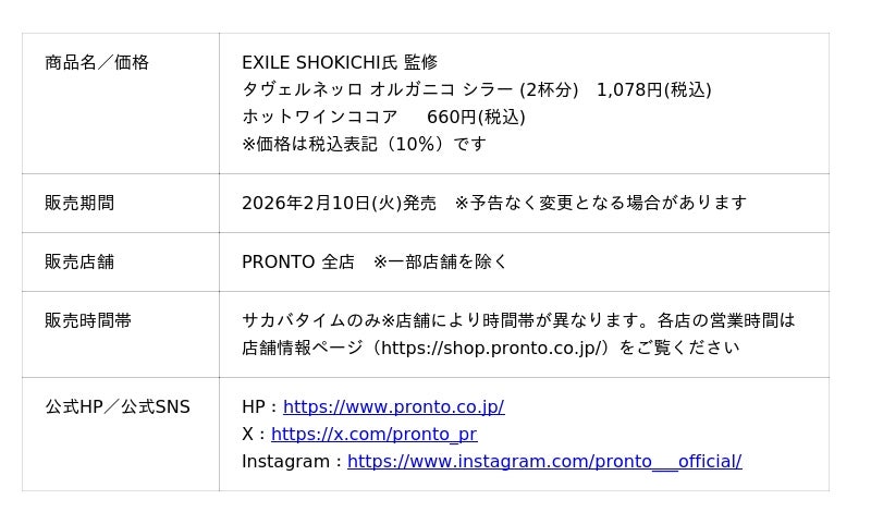 飲食チェーン『PRONTO (プロント)』や『ワインの酒場。 Di PUNTO (ディプント)』などを展開する株式会社プロントコーポレーション(本社:東京都港区、代表取締役社長:杉山和弘)は、2026年2月10日(火)よりEXILE SHOKICHI氏監修の「タヴェルネッロ オルガニコ シラー」及び同商品を使用した「ホットワインココア」を全国の『PRONTO(プロント)』限定で発売します。
