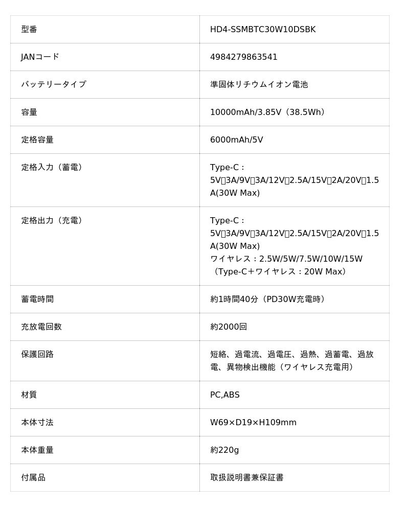 近年、モバイルバッテリーの発熱や発火事故に対する不安の声が増加する中で、「準固体電池モバイルバッテリー/HD4-SSMBTC30W10DSBK」は 準固体電池を採用。液体電解質と比べて内部構造が安定しており、バッテリー内部の 熱暴走や発火リスクを大幅に低減しています。特に日常使いだけでなく、 旅行や災害時の備えとしても安心 の設計です。