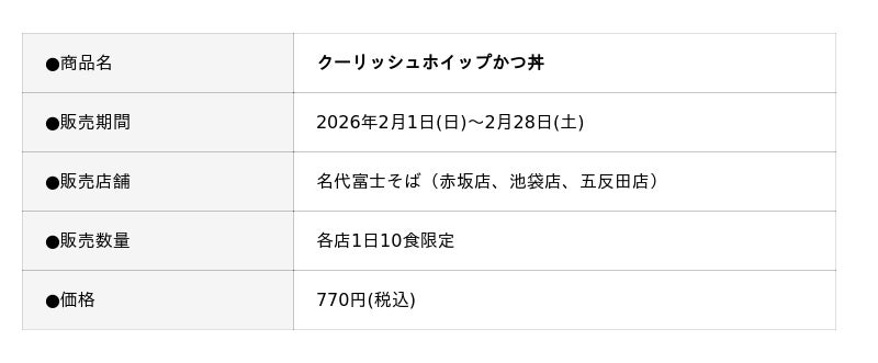 株式会社ロッテ(東京都新宿区、代表取締役社長執行役員:中島英樹)の“飲むアイス”「クーリッシュ」ブランドから2026年1月12日(月)発売されたばかりの「クーリッシュ ホイップクリーム」と、立ち食いそば・うどんチェーン店の「名代富士そば」との夢のコラボレーションが実現しました。数量限定の新メニュー名は『クーリッシュホイップかつ丼』。2026年2月1日(日)から2月28日(土)の期間、名代富士そば赤坂店、池袋店、五反田店にて、1日10食限定で販売します。玉子の中に「クーリッシュ ホイップクリーム」を混ぜ合わせて、かつをとじた今回特製の「かつ丼」に、さらに「クーリッシュ ホイップクリーム」をトッピングすることで完成する超COOLな「かつ丼」です。名代富士そばならではの出汁がしっかり効いた甘みのある「かつ丼」に「クーリッシュ ホイップクリーム」の甘さと冷たさがマッチし、まろやかでコクのある、まさかのおいしさが楽しめるコラボレーションになりました。寒さの厳しいこれからの時期にこそ、COOLな“飲むアイス”を温かい「かつ丼」と一緒に、“食う”リッシュ!