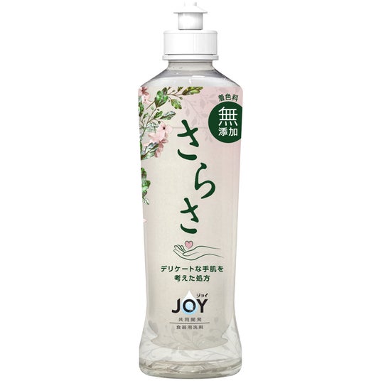 「さらさ 食器用洗剤」は、デリケートな手肌を考えた処方でありながら、ジョイと共同開発した高い洗浄力を実現しました。着色料不使用で、哺乳びんやストローの洗浄にも使用できます。また、すすぎ時間を約半分に短縮*⁴して、水に触れる時間が短くなります。手肌を大切にしながら毎日の食器洗いをより快適にします。