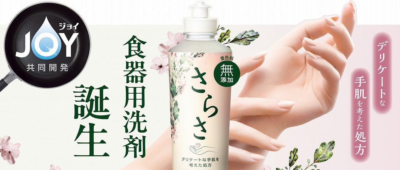 近年、手は年齢が表れやすい部位として、日常的にハンドケアやネイルを楽しむなど、手元の美しさを意識する生活者が増えています。一方、食器洗いでは「洗い上がりに妥協できない」という意識が根強いので、手肌のことを考えた洗剤は「洗浄力が弱そう」という印象から選ばれにくく、洗浄力の高い洗剤を選ぶ傾向が続いています。また、手袋を使用する方が増えていますが、汚れ落ちや洗剤残りが手の感触から分かりにくく、使いにくいと感じる方も少なくありません。このような「手肌を大切にしたい」と考える方々に応えるため、無添加*¹洗剤ブランド『さらさ』から、ジョイと共同開発した「さらさ 食器用洗剤」を新たに発売します。