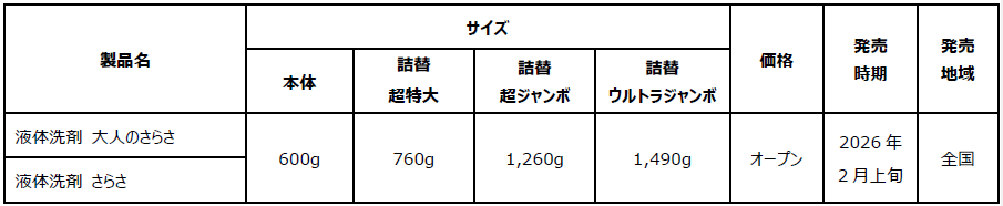 P&Gジャパン合同会社(本社:神戸市)は、無添加*¹衣料用洗剤・柔軟剤ブランド『さらさ』から、衣料用洗剤・食器用洗剤の2つのカテゴリから新製品を発売いたします。衣料用洗剤は、衣類と肌の摩擦を軽減し、大人の乾燥肌を優しく包み込む「衣料用洗剤 大人のさらさ」を新発売いたします。さらに、「さらさ 食器用洗剤」も新登場。デリケートな手肌を考えた処方なのに、食器用洗剤のジョイと共同開発で、油汚れもスッキリ落とします。「衣料用洗剤 大人のさらさ」は2026年2月上旬、「さらさ 食器用洗剤」は2026年2月中旬より全国で発売開始いたします。